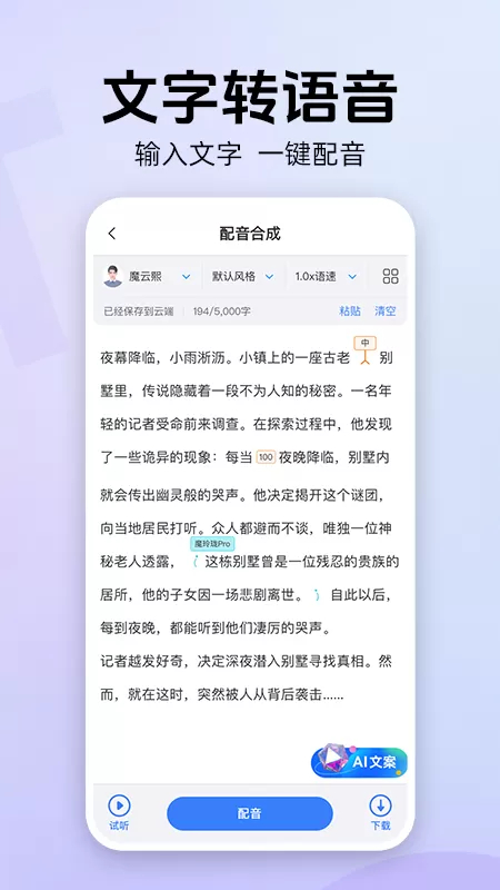 你是否在寻找一款能媲美真人的AI配音软件?「魔音工坊」就是你的不二之选,它能助您轻松配出优质好声音。无论是视频配音、新闻播报,还是有声书录制、有声电台制作,亦或是外语出海相关的配音工作,「魔音工坊」都能大显身手。这款软件拥有800多款丰富多样的声音,风格更是多达1000多种,其中还有「满超」、「杨婧」、「采采」等众多明星大咖的声音入驻。而且它操作简单,极易上手,让配音变得轻松愉悦。