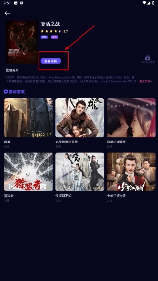 进入对应的影视预览页面后,能够查看基础评分与剧情概要,点击【查看详情】按钮即可获取完整的影视相关信息。