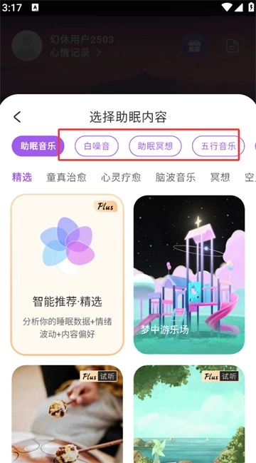 2. 在弹出的助眠页面里,点击下方的音乐模块。