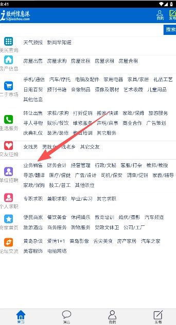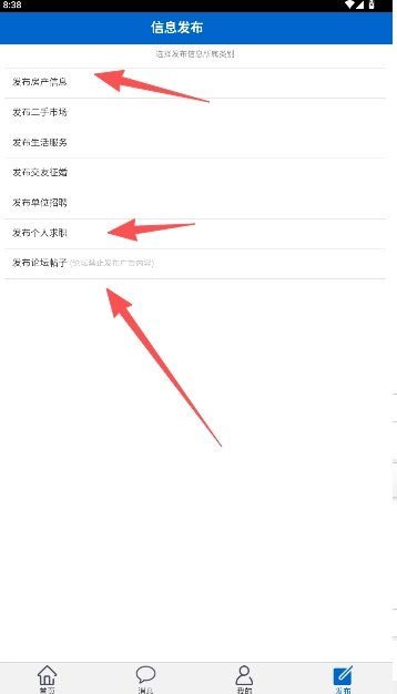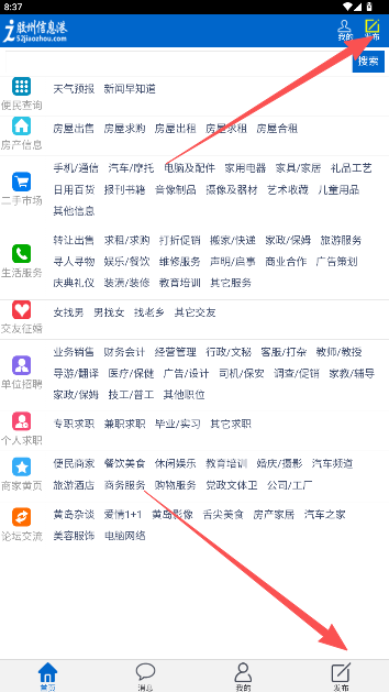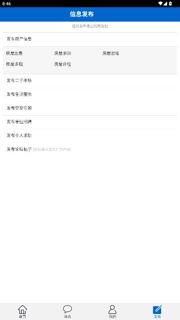 2、内容发布之前,可在房产、二手市场、生活服务、交友征婚、个人求职、论坛帖子和单位招聘等版块选择所属类别。