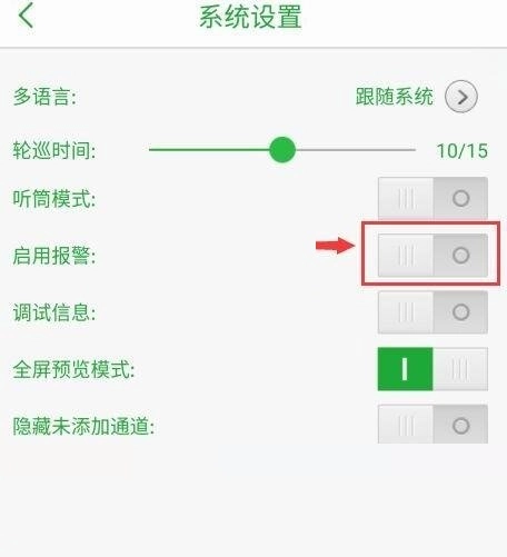 3、进入“系统设置”界面,点击“启用报警”右侧滑块开启报警开关。