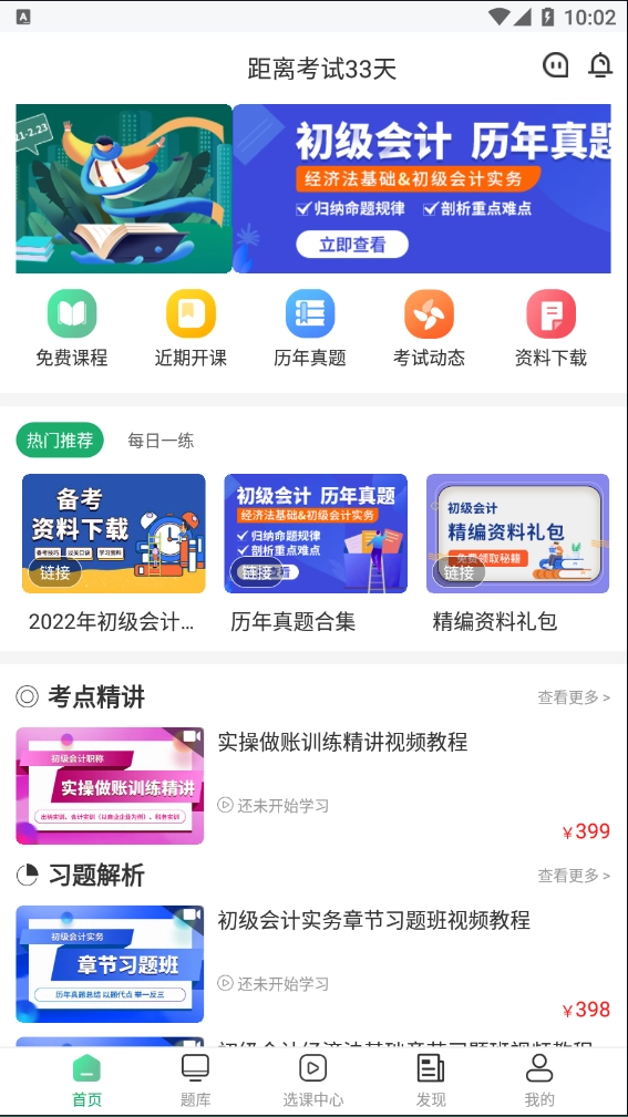 1、打开初级会计师题库软件首页,有免费课程、近期开课等等,还有热门推荐里的历年真题合集和精编资料礼包都是免费的