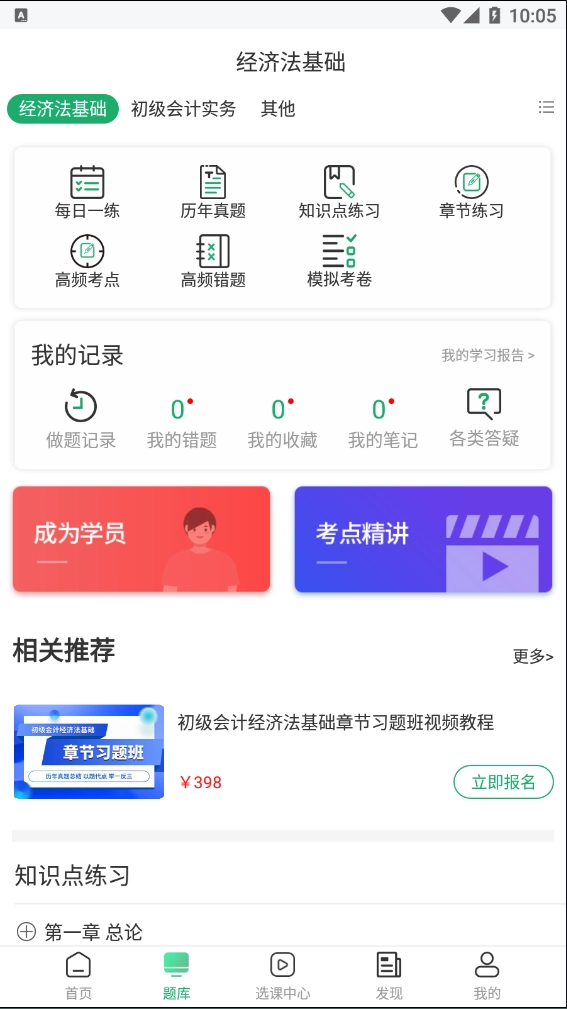 2、切换至题库这一页面,可以看到经济法基础和初级会计实物,想要会计证拿到手,这两门必须多刷题