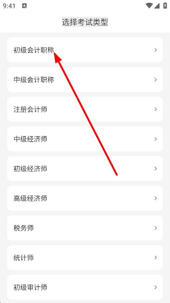 3、完成注册之后,在考试类型选择页面,点击“初级会计职称”选项,即可进入初级会计职称相关的学习页面。