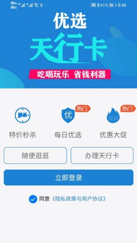 天行卡优选是一款为用户打造的省钱购物应用,覆盖旅游、住宿、购物、游戏、餐饮、美容等各类生活服务,能满足不同用户的生活消费需求。它还会依据你的位置,推荐同城热门商家供你挑选,让你能品尝到更多美味。用户可在此预订酒店和餐厅,减少排队等待时间,也能在线购买电影票。此外,它提供便捷的外卖服务,让你足不出户就能买到心仪美食,还能通过手机操作;同时,平台还为用户准备了大量优惠券,让你享受更多折扣优惠。快来体验一下吧!