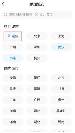 进入页面后,既可以选择直接定位自己所在的城市,也能手动进行添加。