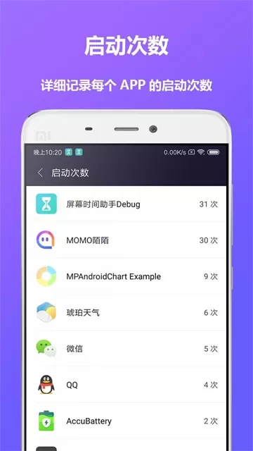 3、助力习惯养成:通过数据呈现和依赖程度判断,引导用户有意识地减少手机使用次数,培养健康的手机使用习惯,提升生活效率。