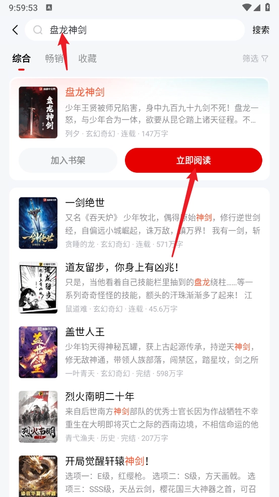输入关键字搜索喜欢的小说资源并点击"立即阅读"。