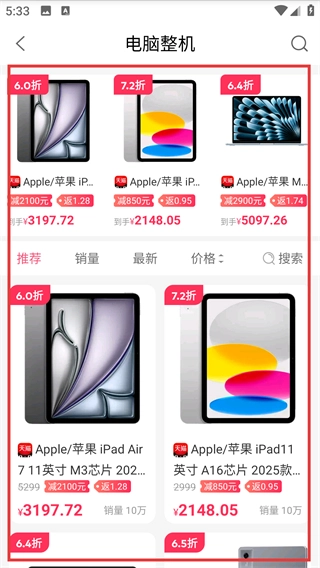 进入【电脑整机】页面后,能看到多款【Apple/苹果】设备,这些设备都标注了折扣、优惠金额和到手价,大家可以根据自己的需求浏览并选购。