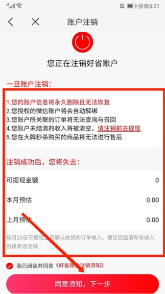 阅读注销说明后,点击下方的“同意须知,下一步”按钮,即可完成账号注销并解除与邀请人的关联。