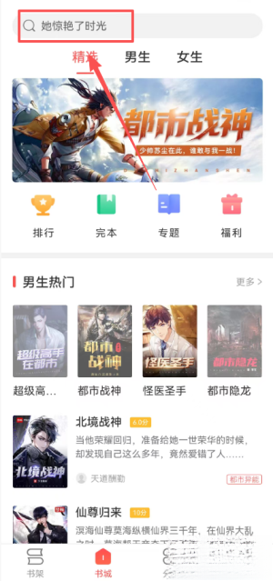 1、在书城界面搜索自己想看的小说,或者从推荐、分类等入口选择感兴趣的小说