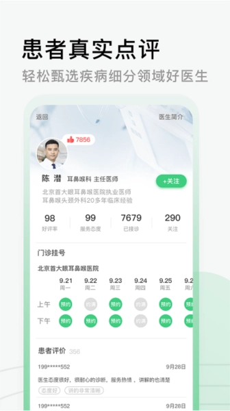 医生点评:用户可以在就诊完之后对医生进行真实评价,帮助其他患者选择合适的医生。