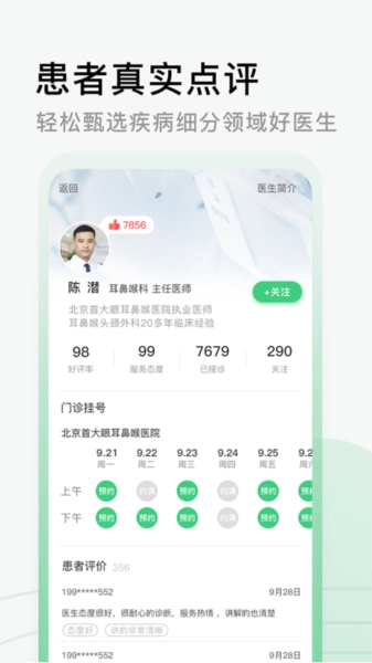 医生评价体系:9版本新增了多维度的医生评价评分体系,覆盖了全国各科室的知名专家医生,能够避开号贩子,保障用户看病时的安心。
