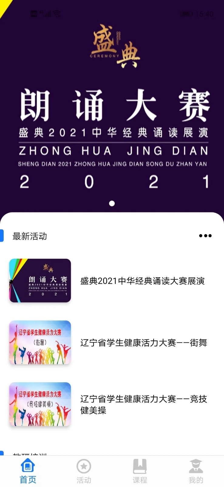 打开软件后,新用户需用手机号登录;首页展示最新活动与教研培训内容。