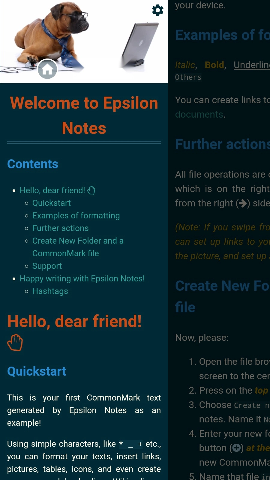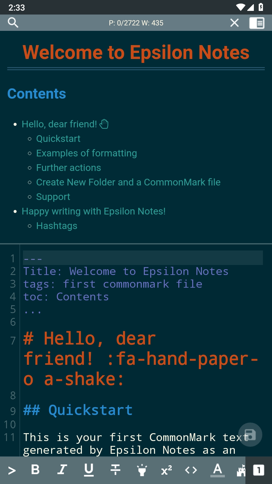 EpsilonNotes是安卓手机上的一款功能强大的Markdown编辑器与Todo列表工具,支持用户完全自定义渲染CSS/JS,拥有移动端独有的分栏即时预览功能,在安卓平板上使用尤为便捷。它可以从文档中生成PDF和HTML代码,还为高级用户提供了兼容性预处理组件,允许创建自定义Markdown标记并调整现有标记,从而让该编辑器能与其他任何Markdown处理器兼容。