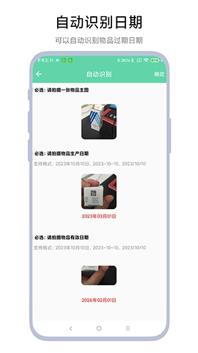 自动识别功能的使用很简单:只需用软件拍摄产品的过期日期,它就能自动识别出所拍摄的日期信息。