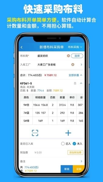 布料辅料采购:用户可借助手机便捷完成布料辅料的采购流程,并能实时了解采购的进展情况。系统会自动保存每次采购的具体信息,像采购的数量、价格以及供应商等内容都包含在内,便于用户后续进行查询与统计工作。