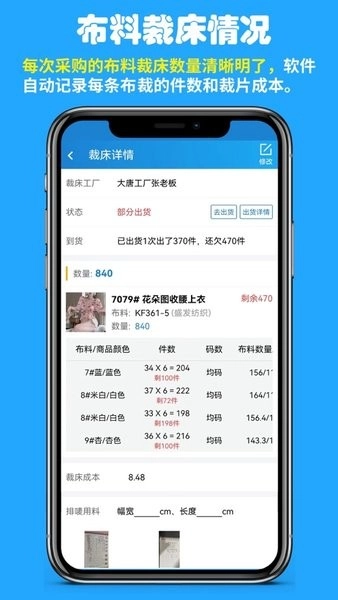拥有裁床数量、出货数量以及布料空差的监控功能,可及时察觉生产过程里的异常状况。