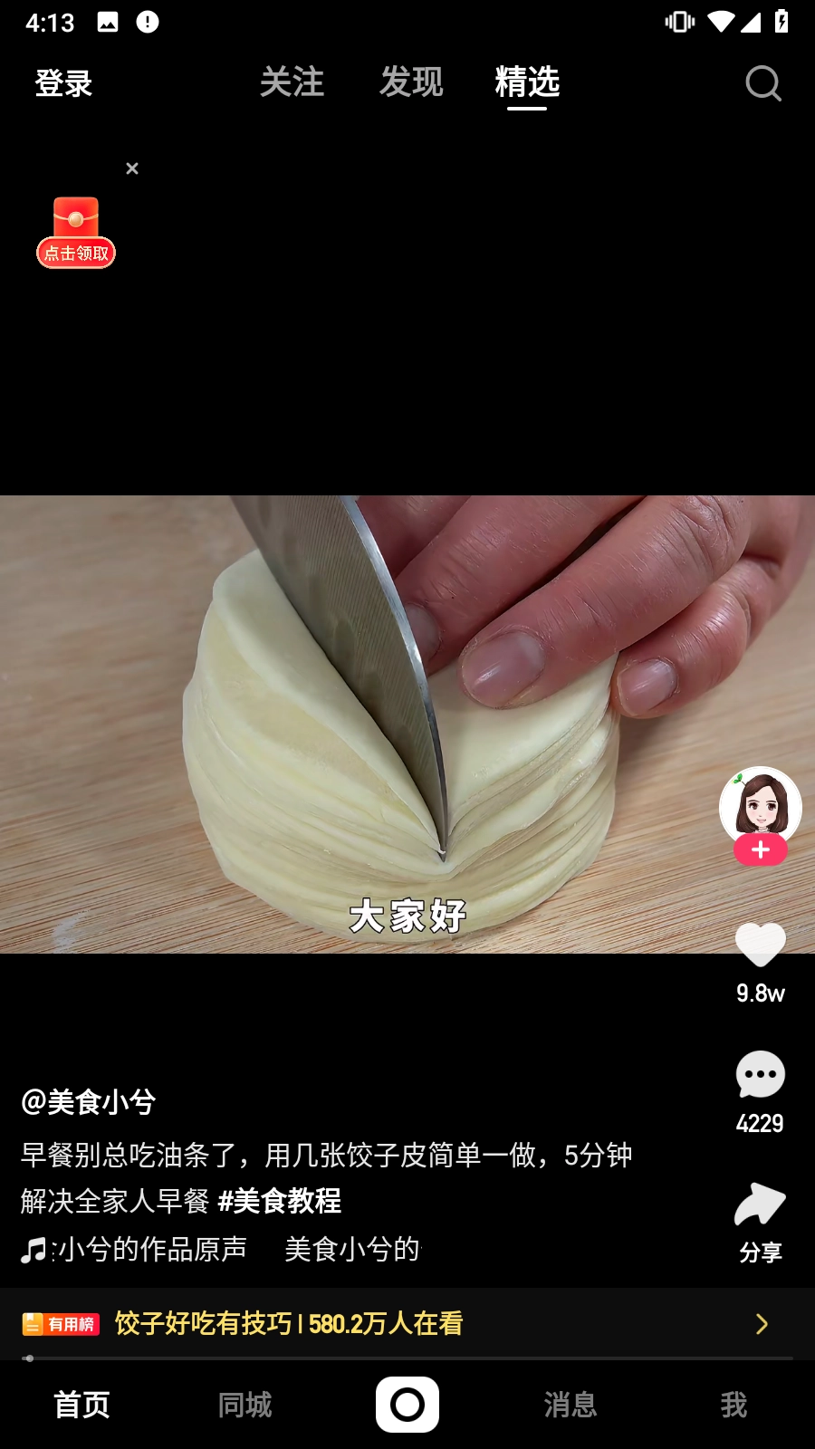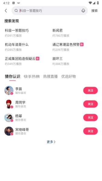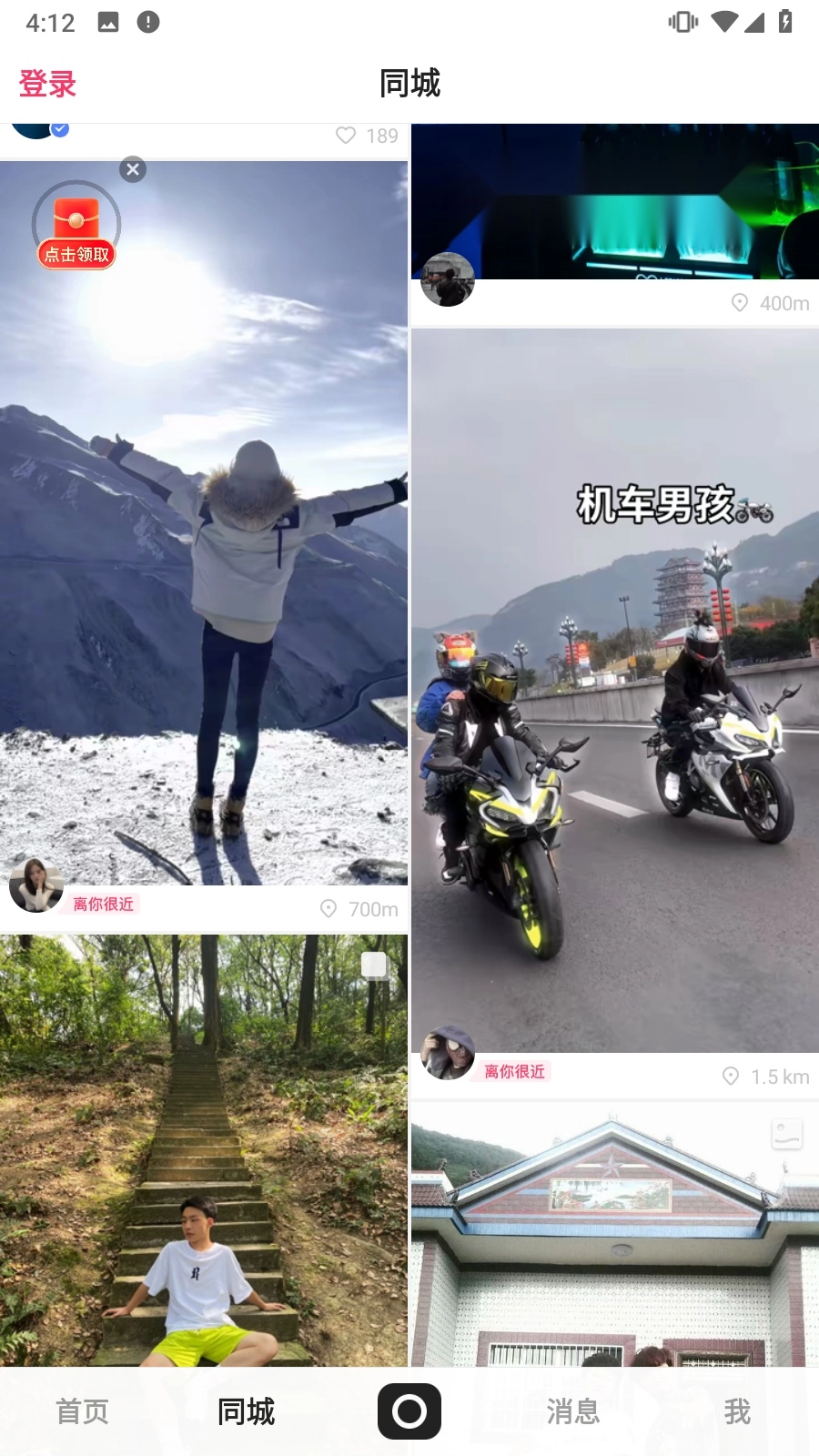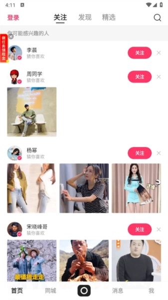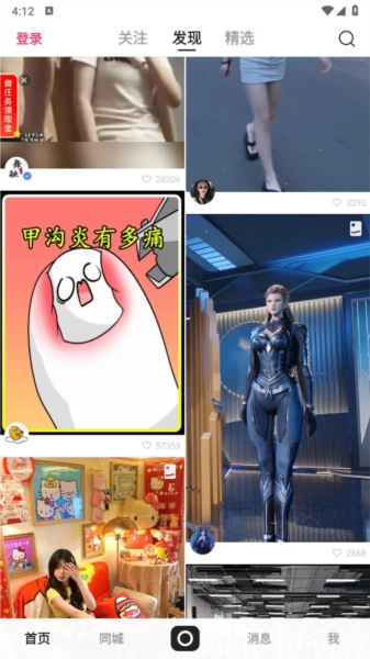 功能入口:顶部导航栏支持切换“关注”“发现”“同城”等频道。