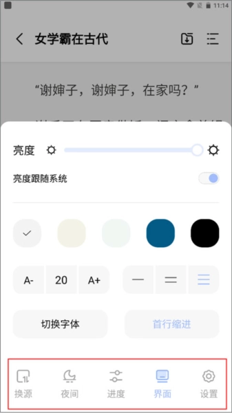 当你开启阅读模式后,点击屏幕便能调出阅读模式的设置功能,你可以借助它进行换源、调整阅读进度、设置界面样式等操作。
