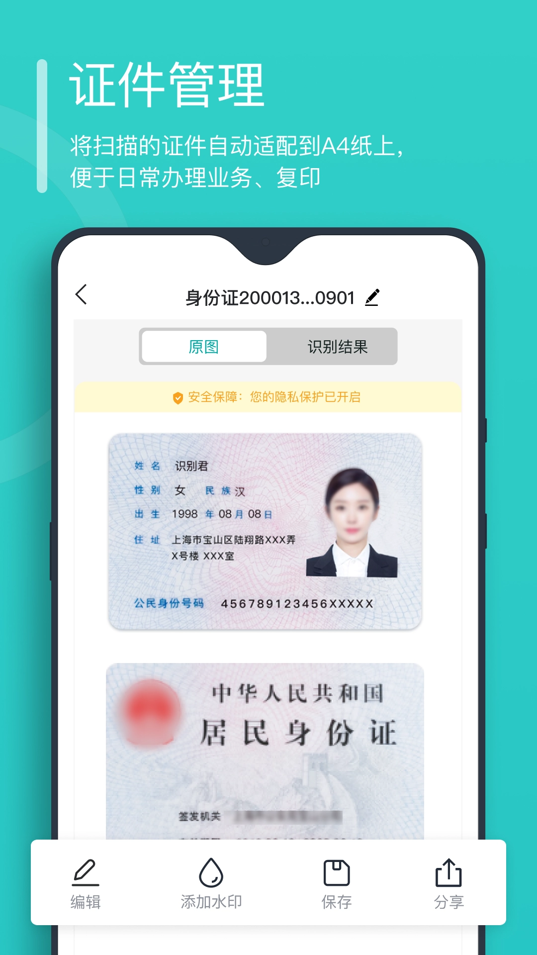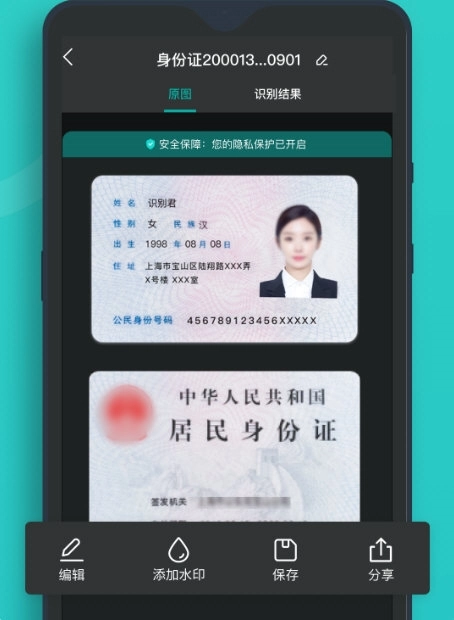 【证件识别】具备证件扫描识别能力,能够一键将识别结果导出为图片等格式的文件。