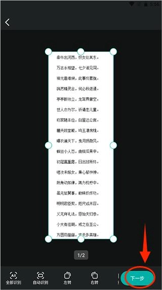 在图片编辑界面选定识别区域,可选择全区域识别或系统自动识别,点击“下一步”按钮即可启动识别流程。