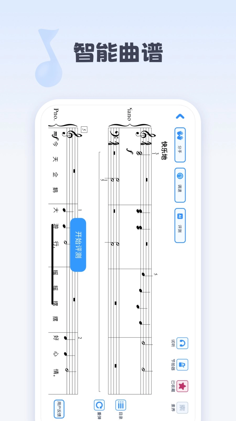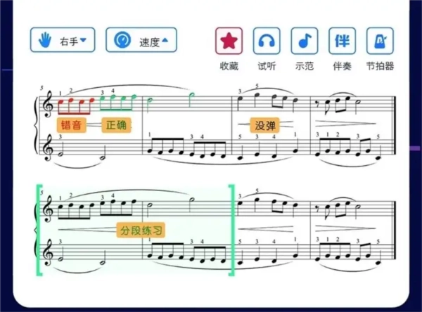 智能识谱与纠错功能:借助先进的AI智能算法,钢琴巴士可通过音频识别技术,助力学习者迅速修正弹奏中的错音。练习时,一旦出现错误音符,App的节奏进度条会暂停,同时屏幕下方的键盘区域会高亮显示正确的应弹音符,让学习者能即时察觉并纠正问题。