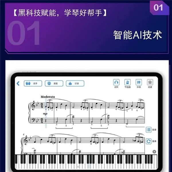 上海音乐出版社打造“智能7+1双引擎”钢琴学习新体验,借助“正版琴谱与钢琴巴士App”的深度融合,让钢琴学习者能享受到14项增值服务,具体包含两大部分:一是7大音乐科技交互功能,如唱谱、示范、调速、分手练习、伴奏配合、教学指导、测评反馈;二是7大美育素养创新内容,涵盖音乐术语、曲式分析、乐理知识、音乐体裁、难点解析、音乐简史、作品导赏。