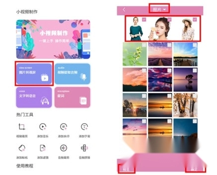 在首页找到图片转视频的功能入口,添加2到5张人像图片后,点击预览或者确定按钮即可。