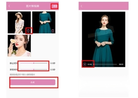 确定后,选择添加或删除图片,设定静止时间与渐变时间,点击合成;制作成视频后,点击保存即可。