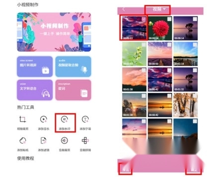 在小视频制作的首页找到“添加水印”选项并点击,接着点击“添加”按钮来选择要处理的视频。
