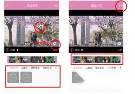 先选择视频的时长,接着点击添加水印的按钮,之后可以对水印进行放大或缩小的调整,最后点击完成按钮即可。