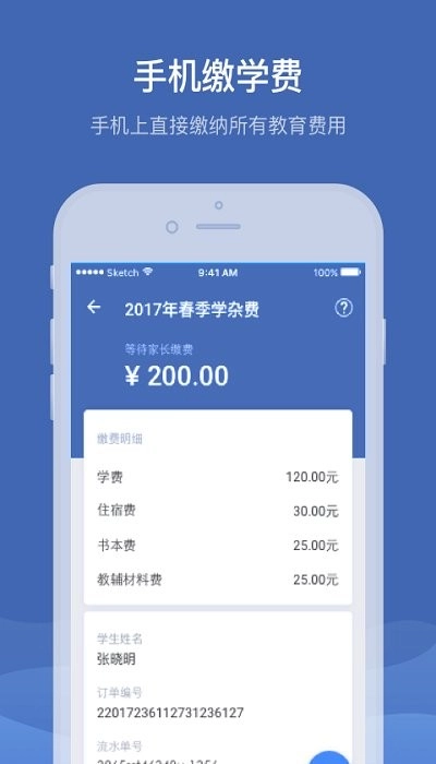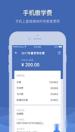 与“教育收费平台”进行对接,接收学校推送的缴费订单,并且可以直接在手机端完成缴费操作。