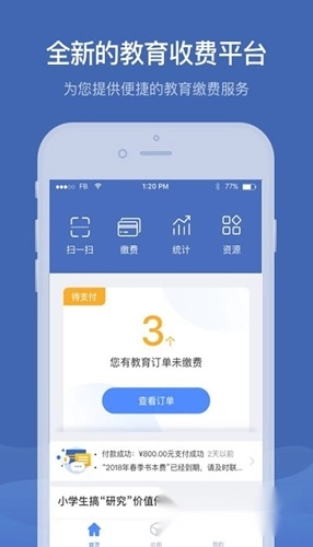缴付通教师在手机上查看缴费进度,以及统计数据。
