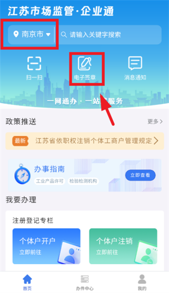 1.点开江苏省市场监管“企业通”进行登录,选择注册地,点击电子签章