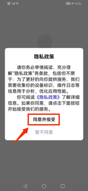 1、首次启动应用,请在隐私政策弹窗点击同意并接受。