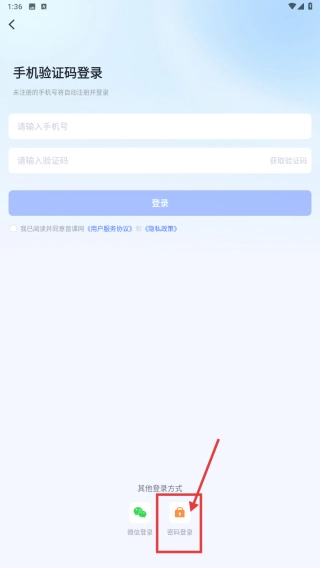 3、在登录选择界面,点击密码登录选项,进入账号密码登录页面。