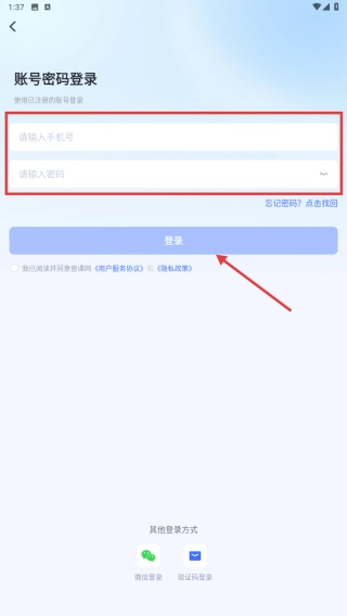 4、在账号密码登录页面,输入手机号和密码,点击登录按钮,完成账号登录操作。