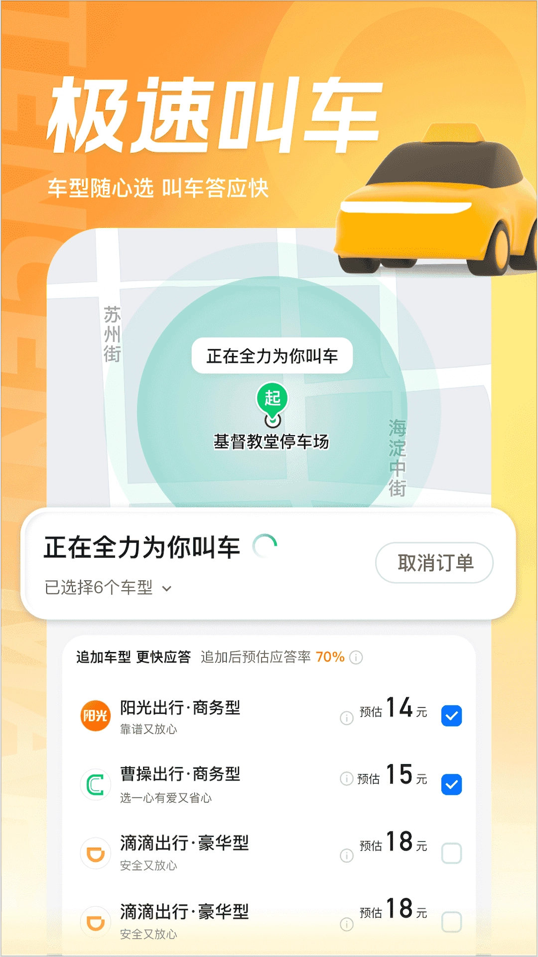 打车全网一键叫车,多种车型同时唿叫,更快出发,聚合多个打车平台,价格透明。