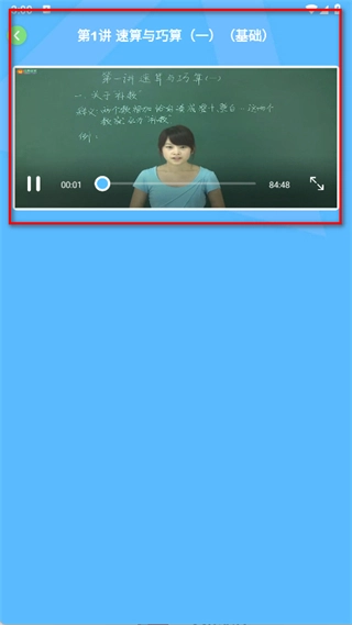 4、当进入观看界面后,点击视频,随即第1讲速算与巧算的课程视频就会开始播放。