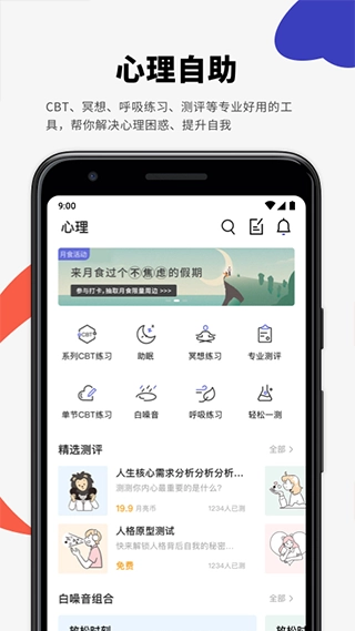 我们的心灵与头脑和身体一样,都需要通过锻炼来强化特定功能。月食围绕缓解焦虑、提升自尊、转变不良依恋、减压助眠等心理调节目标,开发了CBT、冥想、测评等各类专业实用的自助工具,助力你预防和解决轻量级的心理健康需求。