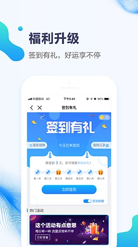 【掌厅专属福利】掌上营业厅独家放送,新用户专享礼、推荐好友礼、每日签到领流量、热门手机限时秒杀,精彩活动持续更新,惊喜好礼送不停。