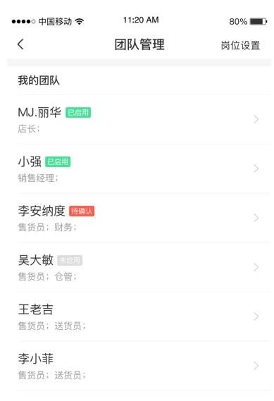 提供管理团队的功能,用户能够查看团队的所有成员,并进行岗位设置等操作。