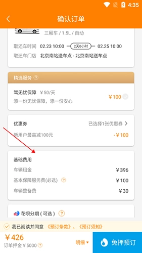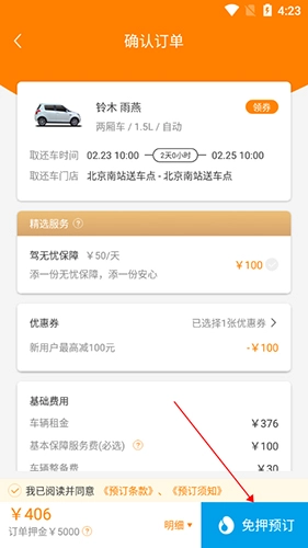 点击免押预定就租车成功了