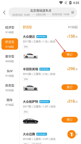 选择需要使用的车辆点击预定按钮