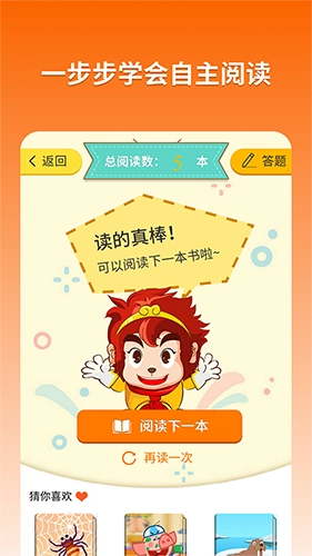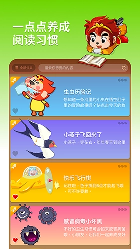悟空阅读是宁波启点教育科技有限公司推出的儿童阅读软件,平台内所有阅读资源均为少儿专属内容,故事设计贴合中国学龄前儿童的认知发展特点。软件精心梳理了成长必备的七类核心内容,涵盖自我管理、社会认知、寓言童话、自然科学、健康户外、传统国学与成语故事。故事内容通俗易懂,便于孩子理解记忆与复述,单篇阅读时长控制在10分钟以内。每篇故事结尾设置了简单的互动问题,助力孩子巩固阅读重点,加深内容理解。