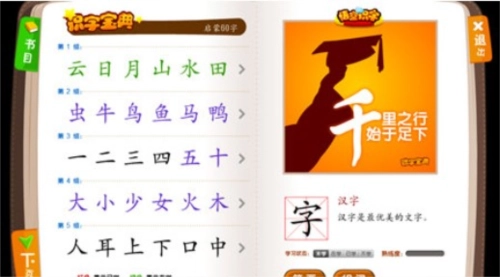 二、识字宝典,您可以借助它手动引导孩子复习,该宝典以每6字为一组,每组都配备4个对应的游戏。