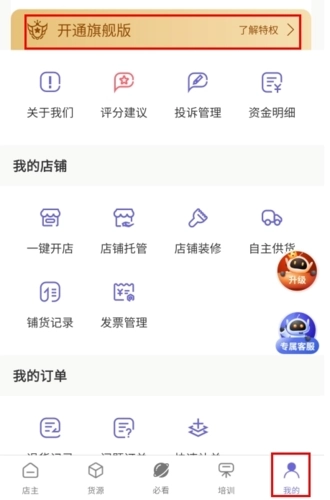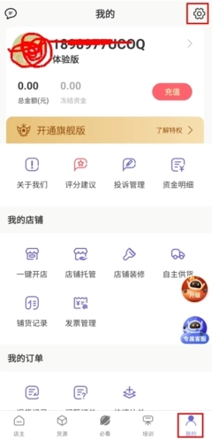 这款软件目前是试用版本,无法进行开店操作,若要开店需在“我的”页面升级开通旗舰版。
