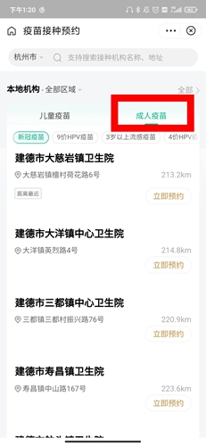 其实方法很简单,回到之前预约疫苗的那个页面,这次我们不用再想着儿童预约的事了,直接点击成人预约选项,接着在弹出的医院列表里随便选一家,点击预约就可以了。