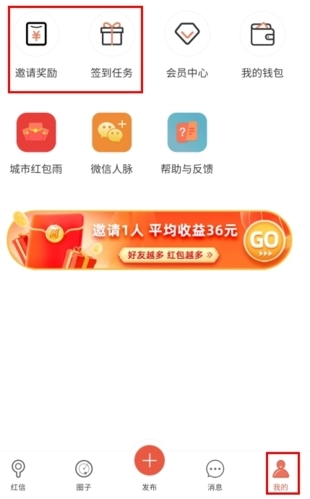 在我的页面汇总点击邀请奖励和签到任务按钮;